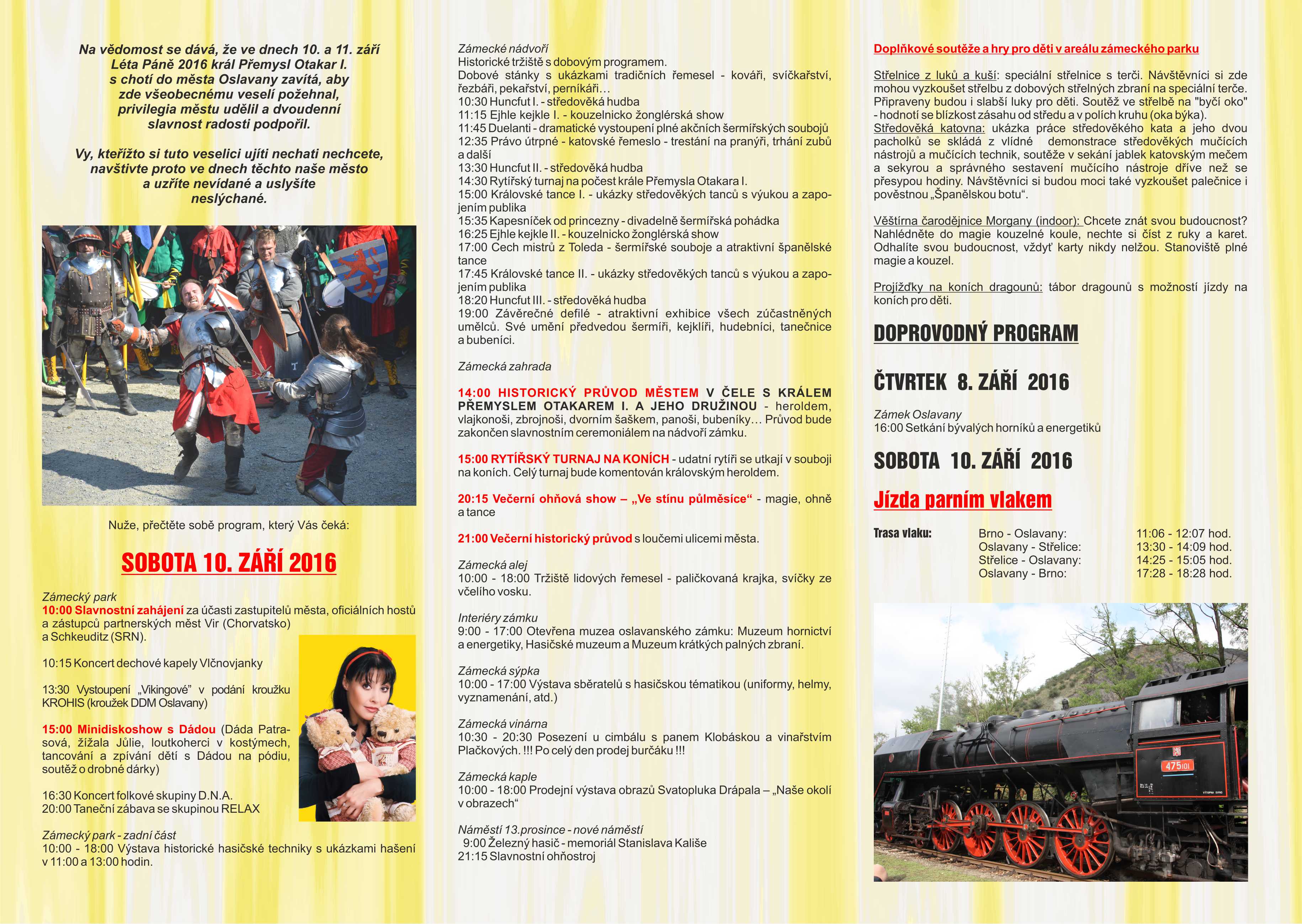 Na vědomost se dává, že ve dnech 10. a 11. září Léta Páně 2016 král Přemysl Otakar I. s chotí do města Oslavany zavítá, aby zde všeobecnému veselí požehnal, privilegia městu udělil a dvoudenní slavnost radosti podpořil. Vy, kteřížto si tuto veselici ujíti nechati nechcete, navštivte proto ve dnech těchto naše město a uzříte nevídané a uslyšíte neslýchané… Přehled doprovodného programu