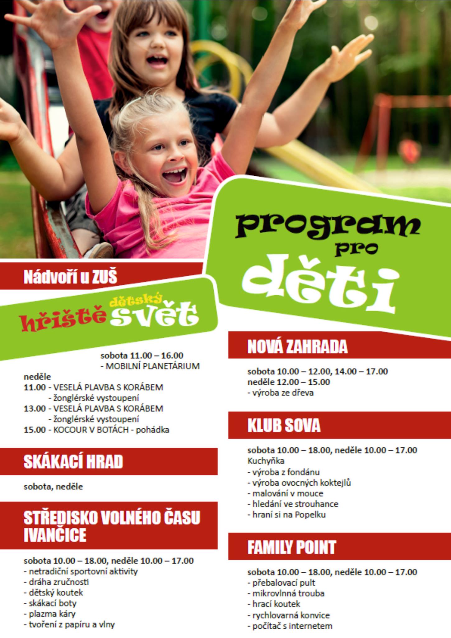 Novinkou pro letošní rok je zóna s programem pro děti v blízkosti nového hřiště Dětský svět, kde bude po celý víkend k dispozici skákací hrad a aktivity připravené Střediskem volného času Ivančice, spolkem Nová Zahrada a Klubem Sova. V sobotu přijede za dětmi mobilní planetárium a v neděli dopluje Divadlo Koráb s žonglérskými vystoupeními a pohádkou.