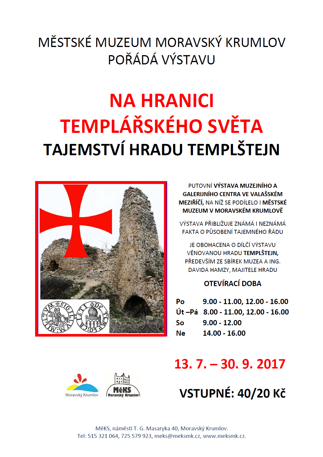 Městské muzeum v Moravském Krumlově zve všechny zájemce na výstavu o templářích a hradu Templštejn, kterou je možné v muzeu (Knížecí dům na náměstí) vidět od 13.7. do 30.9.2017. Výstava přibližuje známá i neznámá fakta o působení tajemného řádu a je obohacena také o dílčí výstavu věnovanou hradu Templštejn. Součástí výstavy budou i nálezy z hradu, které nebyly doposud nikdy veřejně vystavovány.