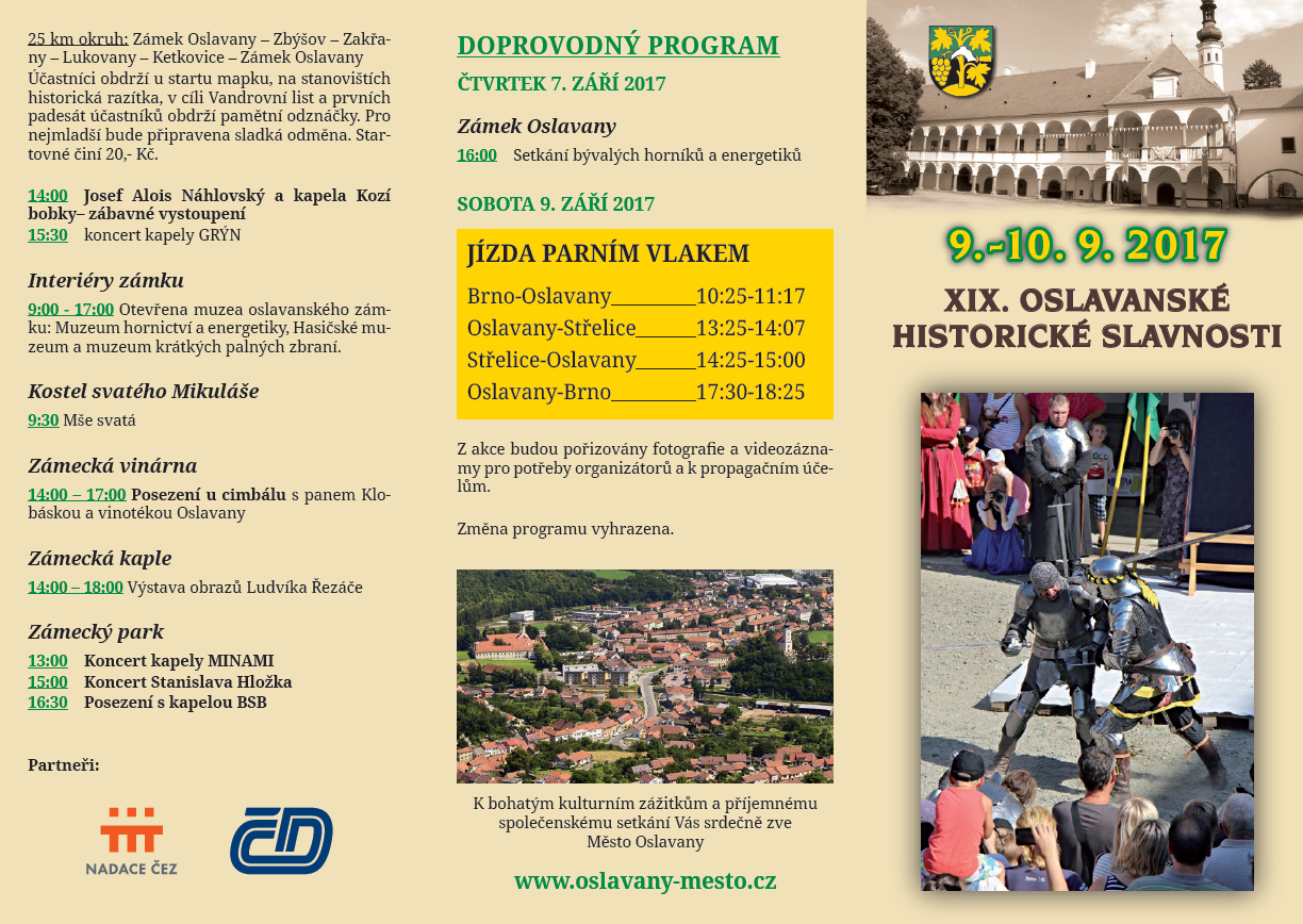 Na vědomost se dává, že ve dnech 9. a 10. září Léta Páně 2017 král Přemysl Otakar I. s chotí do města Oslavany zavítá, aby zde všeobecnému veselí požehnal, privilegia městu udělil a dvoudenní slavnost radosti podpořil. Vy, kteřížto si tuto veselici ujíti nechati nechcete, navštivte proto ve dnech těchto naše město a uzříte nevídané a uslyšíte neslýchané.