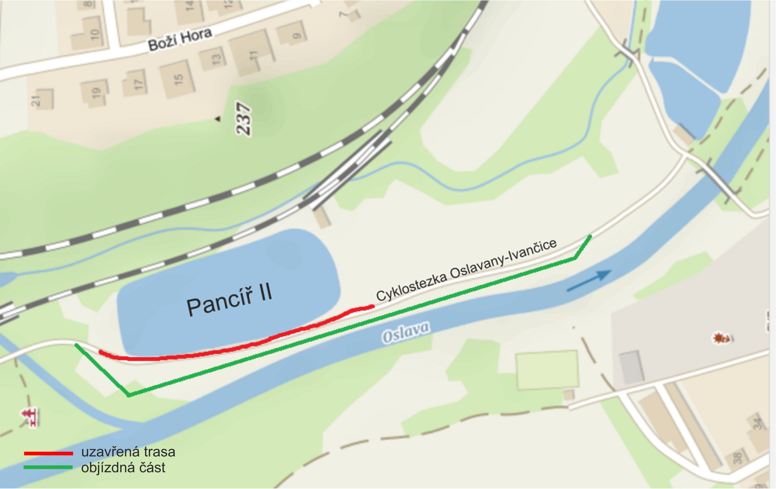 V sobotu 12. 5. 2018 v době od 5.00 do 14.00 hod. a v neděli 13. 5. 2018 v době od 7.00 do 13.00 hod. bude částečně omezen provoz na cyklostezce Oslavany-Ivančice. Jedná se o cca 280 m dlouhý úsek v okolí rybníka Pancíř II v Ivančicích (viz mapka), a to z důvodu konání rybářských závodů. Cyklostezka bude v tomto úseku odkloněna podél řeky. Pěší pohyb účastníků cyklostezky nebude v průběhu závodů nijak omezen a mohou se v prostoru rybníka pohybovat s trochou opatrnosti bez omezení.