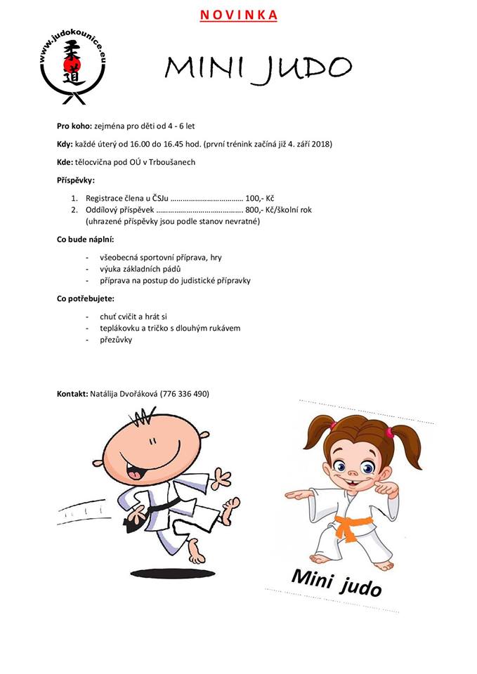- Náš klub otvírá novou tréninkovou skupinu – mini judo. Budeme se těšit na děti od 4 do 6 let, a to každé úterý od 16,00 do 16,45 hod.