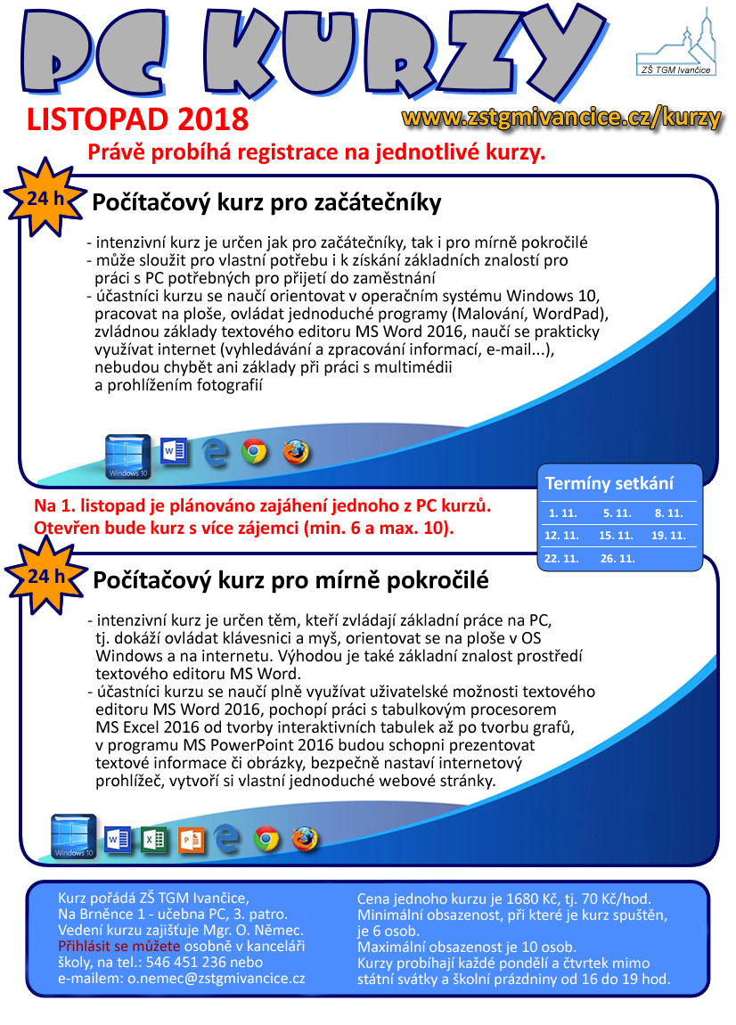 ZŠ TGM Ivančice plánuje od 1. listopadu 2018 zahájit Počítačový kurz pro začátečníky nebo Počítačový kurz pro mírně pokročilé. Otevřen bude kurz s více zájemci (min. 6 a max. 10).