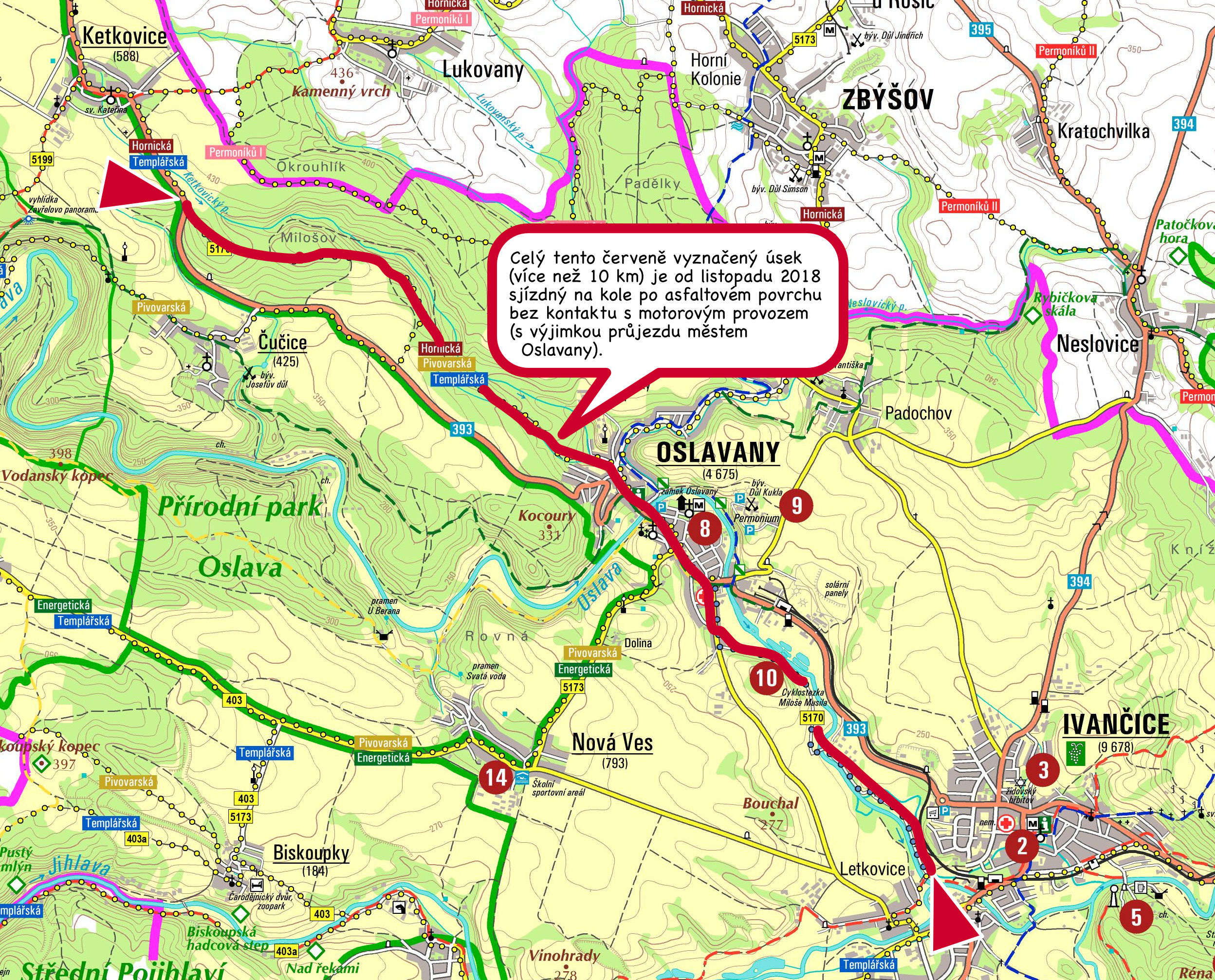 Úsek cyklostezky od obce Ketkovice v lesním úseku od části Milošov do Oslavan, po které jsou vedeny cyklotrasy KČT 5170, a okruhové tematické cyklostezky Hornická, Templářská a Pivovarská má nový asfaltový povrch. Po více než dvacetileté intenzivní těžbě v polesí byla stávající lesní silnička totálně zničená. Pro „sváteční cyklisty“ a rodiny s dětmi byla takřka nesjízdná. Byli proto nuceni využívat frekventovanou komunikaci II/393.