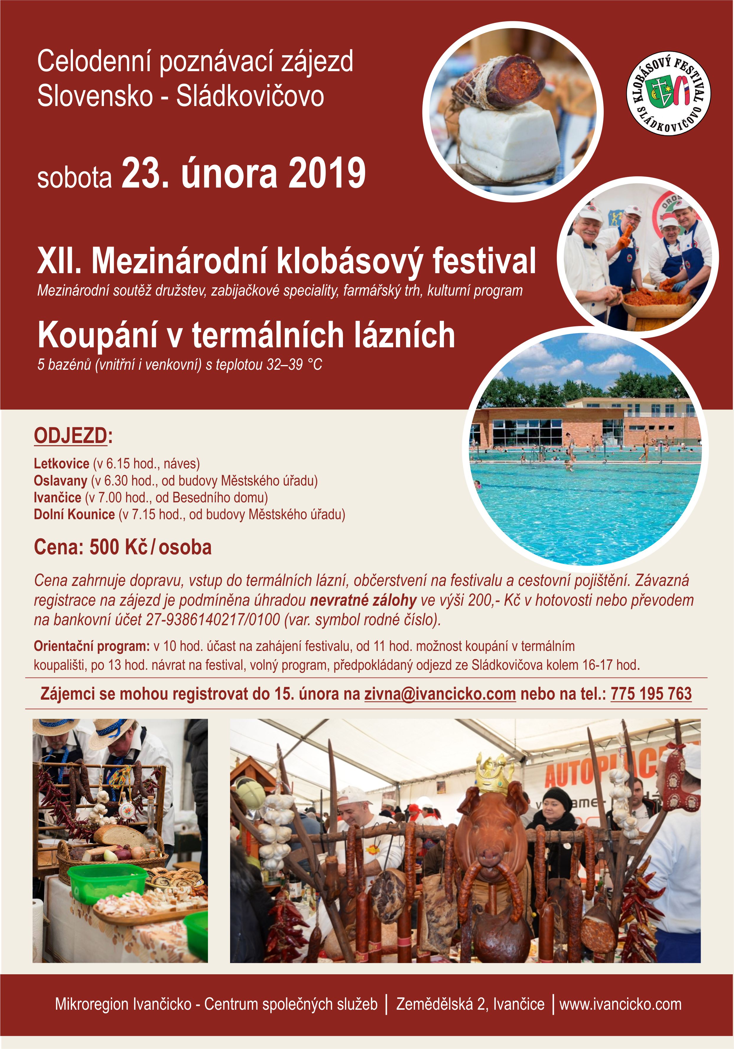 Cena zahrnuje: dopravu, vstup do termálního koupaliště, občerstvení na festivalu a cestovní pojištění. Vzhledem k omezené kapacitě autobusu (55 míst) a v případě vašeho zájmu, co nejdříve kontaktujte Centrum společných služeb Mikroregionu s nahlášením jmen účastníků (e-mail: zivna@ivancicko.com, nebo tel. 775 195 763). Společně se jmény přihlášených zájemců prosíme i o kontakty a rodná čísla pro účely cestovního pojištění.