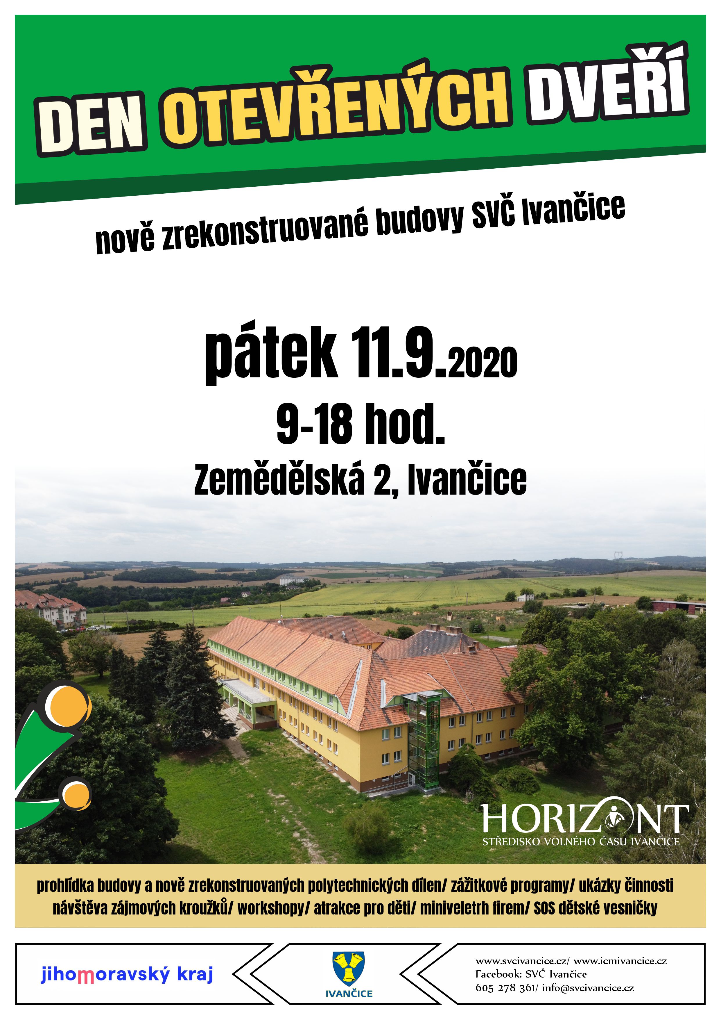Budova Střediska volného času Ivančice prošla velkou rekonstrukcí a její výsledek si můžete zblízka prohlédnout také vy. SVČ Ivančice zve všechny na den otevřených dveří, který proběhne v pátek 11. 9. 2020 v době od 9 do 18 hod. Součástí bude prohlídka budovy a nově zrekonstruovaných polytechnických dílen, zážitkové programy, ukázky činnosti, návštěva zájmových kroužků, workshopy, atrakce pro děti, SOS dětské vesničky a také regionální miniveletrh firem.