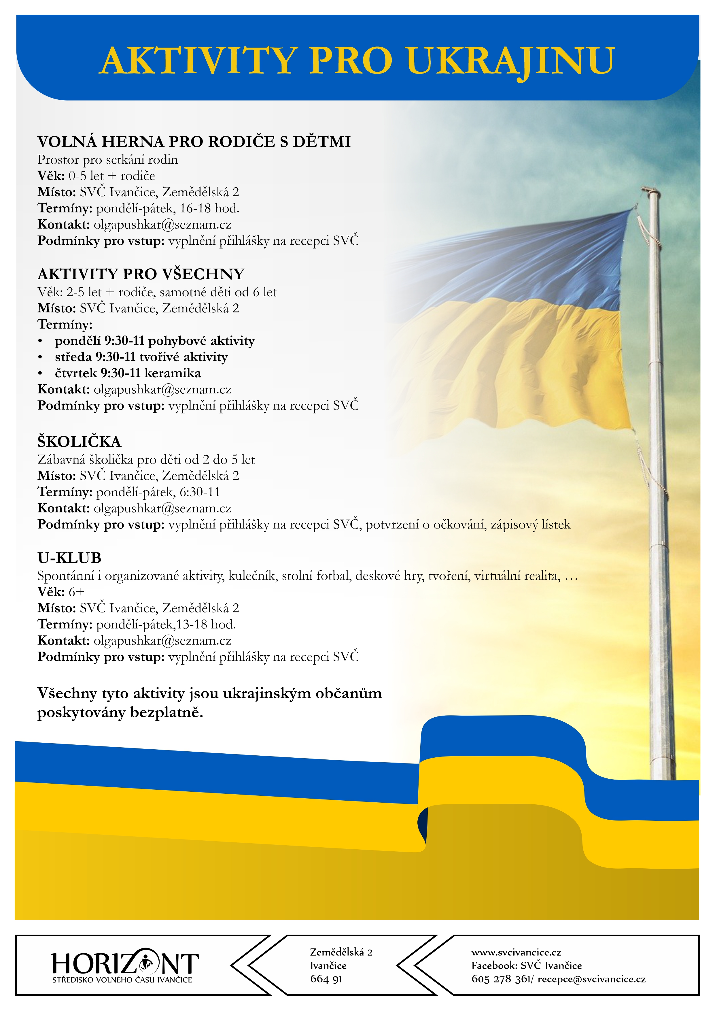 SVČ Ivančice nabízí bezplatně ukrajinským občanům volnočasové aktivity. Nabídku si můžete pročíst v přiloženém plakátku.