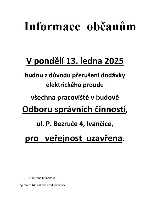 Oznámení o přerušení dodávky elektrické energie 30. 1. 2025 od 7:30 do 15:00 hod. v oblasti Kamenného vrchu.